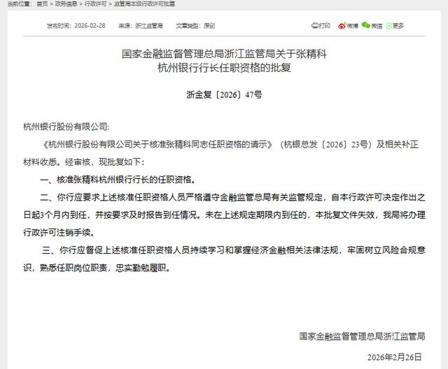 再看2026年2月,国家金融监督管理总局浙江监管局正式核准杭州银行行长任职资格的张精科,这不只是“漂亮的人事新闻”,更是标志性的补位,由副行长升任行长。