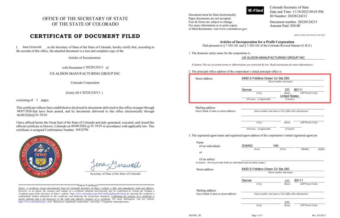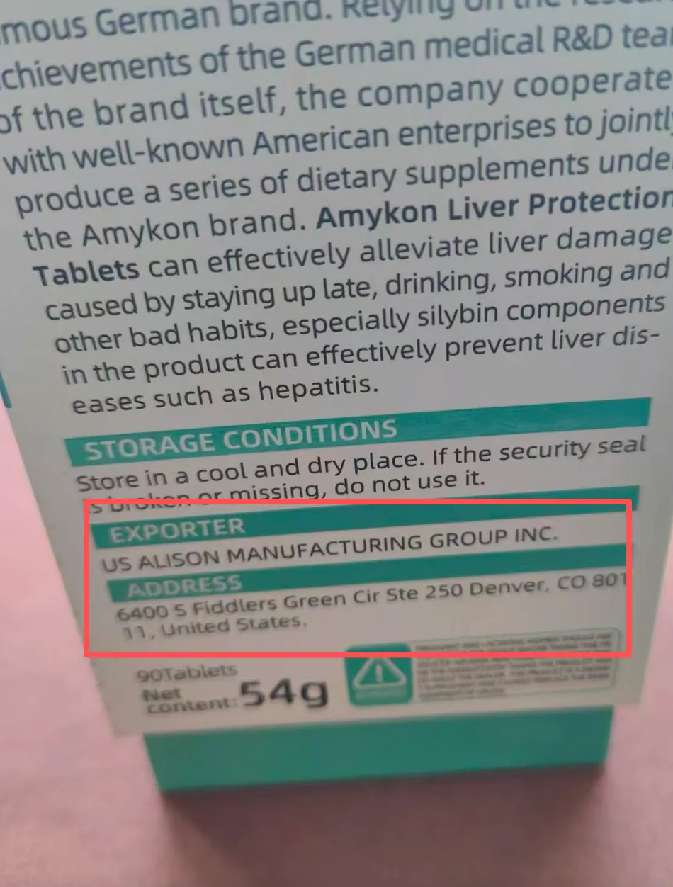 蓝鲸记者查询了该品牌多款产品的外包装。在一款护肝片包装上,出口商为“US ALISON MANUFACTURING GROUP INC”,地址为“6400 S Fiddlers Green Cir Ste 250 Denver, CO 80111, United States”。