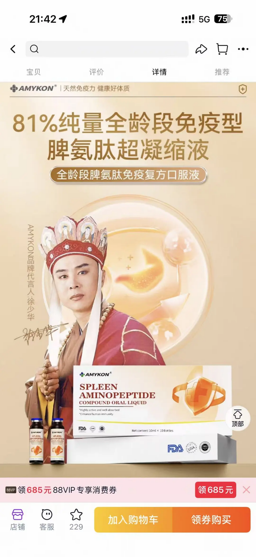 蓝鲸记者查询AMYKON安美心旗舰店发现,该店铺主营人参皂苷、护肝片、驼奶粉、冻干粉口服液等产品,主打术后恢复、免疫调节、滋补元气等功效。品牌由知名演员徐少华代言。