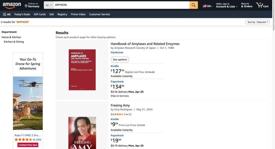 然而,记者在亚马逊、ebay等国际电商平台上以德国、美国等为地址,搜索“AMYKON”发现,未检索到该品牌任何相关产品信息。