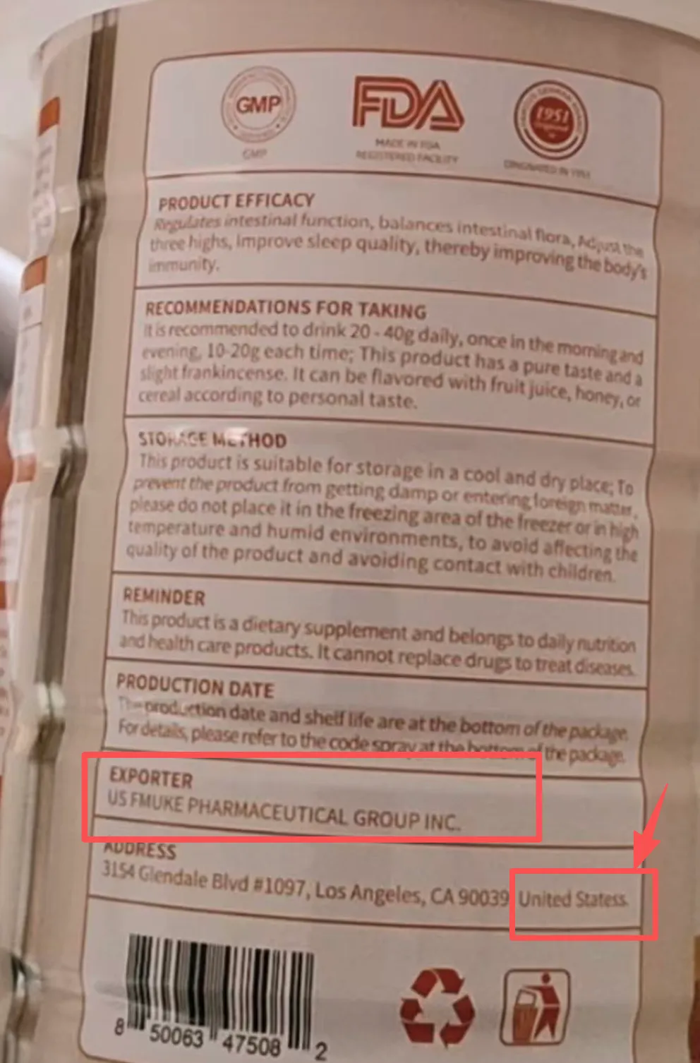 此外,在驼奶粉的包装上,记者看到,公司为“US FMUKE PHARMACEUTICAL GROUP INC”,地址为“3154 Glendale Blvd#1097, Los Angeles, CA 90039, United States”。