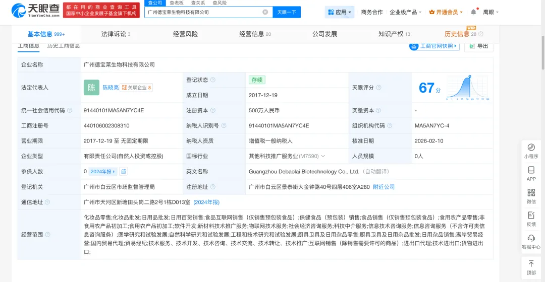 该公司成立于2017年,法定代表人为陈晓亮,注册资本500万元,主营食品销售等业务,地址为广州市白云区景泰街大金钟路40号四层406室A280。该公司背后实控人为章海,持股90%,丽水晨晨生物科技有限公司持股10%,背后同样没有德国美国资本。