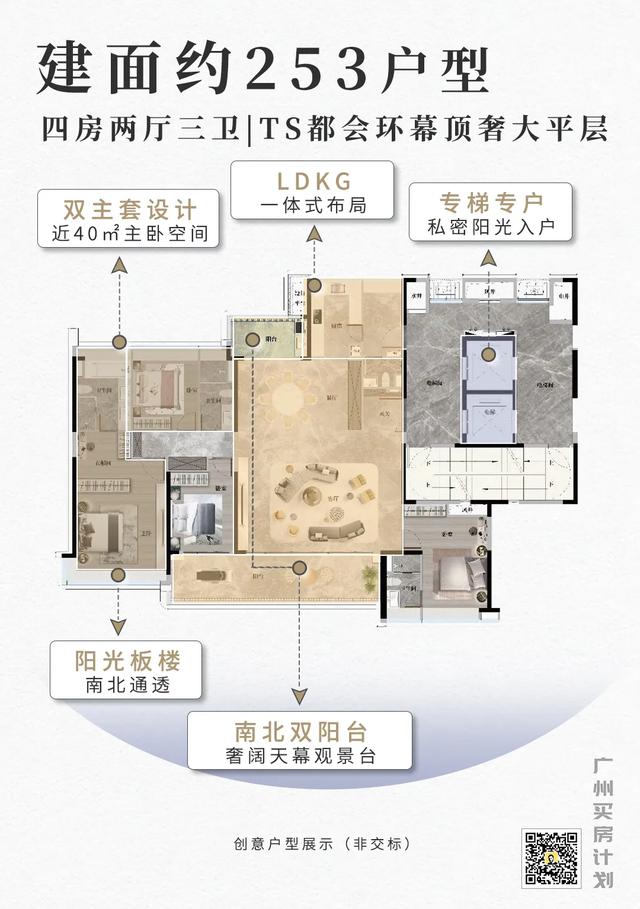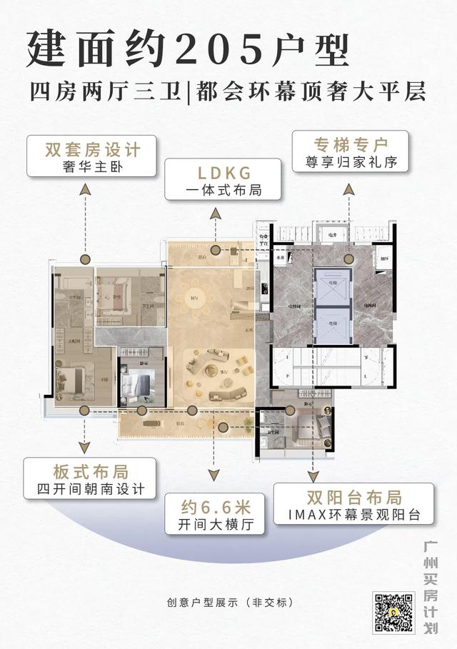 建面约205-253㎡央景楼王奢装大平层,双套房四房设计,板式南北对流双阳台。