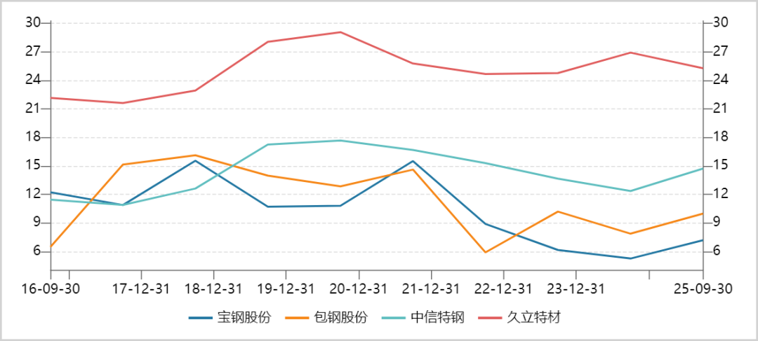 2021年三季度到2025年三季度,宝钢股份、包钢股份的营收年复合增速均为个位数负值,净利润增速更是大幅下滑(宝钢-22%,包钢-50%),包钢还出现过两年亏损。