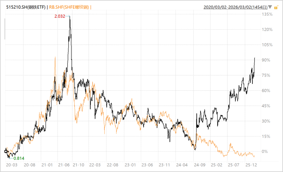 ▲钢铁板块VS螺纹钢,来源:Wind