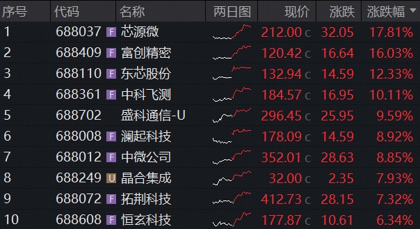 盘面上,半导体设备、存储芯片、算力芯片等全链拉升,芯源微盘中一度触及20CM涨停,收涨17.81%;富创精密、东芯股份、中科飞测均两位数上涨。此外,澜起科技、中微公司涨超8%,芯原股份涨近6%,海光信息涨近4%,中芯国际一度大涨6%,市值冲击6000亿元。富创精密、盛科通信-U、睿创微纳、杰华特等多股历史新高。