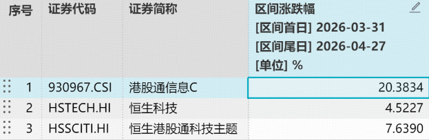 统计区间:2026.3.31-2026.4.27。港股通信息C指数2021-2025年年度历史收益分别为:-9.54%、-34.47%、-0.25%、21.58%、39.30%。指数过往业绩不预示未来表现。