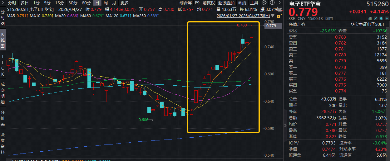 数据统计区间:2026.4.7-2026.4.27。中证电子50指数近5个完整年度的涨跌幅为:2021年,3.27%;2022年,-38.63%;2023年,1.03%;2024年,27.45%;2025年,43.49%,指数成份股构成根据该指数编制规则适时调整,其回测历史业绩不预示指数未来表现。