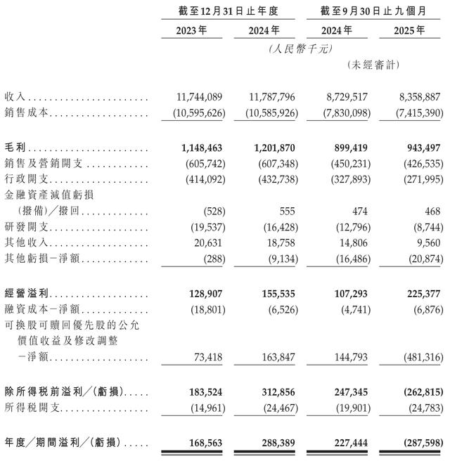 再看利润端,钱大妈2023年、2024年度的净利润分别为1.69亿元、2.88亿元,增速约为71.1%;进入2025年后该公司的盈利能力却急转直下,前三季度录得亏损净额2.88亿元,与2024年同期2.27亿元的净利润形成了鲜明对比。