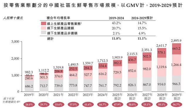 中国高密度聚集的社区场景,孕育出了潜力十足的社区生鲜零售市场。灼识咨询报告显示,2024年线下业态在这一细分市场中占比高达80%,且线下社区生鲜产品零售的连锁化率为44.7%,并预计将进一步提升至2029年的56.7%。
