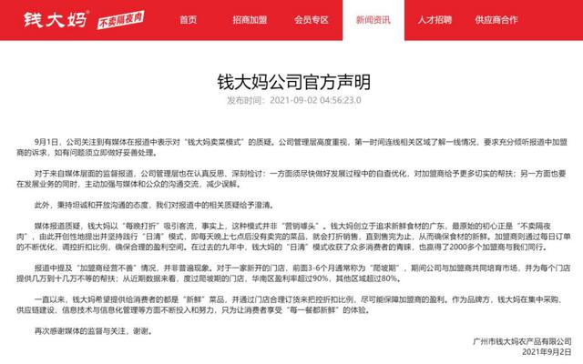 对此,钱大妈则在官网上发布声明称,其“每晚打折”吸引客流的方式并非营销噱头,报道中提及的“加盟商经营不善”情况也并非普遍现象,承诺未来将尽快做好发展过程中的自查优化,对加盟商给予更多切实的帮扶。