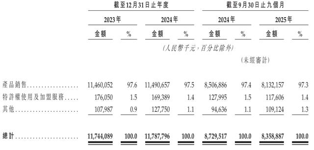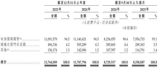 正因如此,诸如产品销售、加盟费、基于销售额的特权使用费等与加盟相关的销售业务,是钱大妈的主要收入来源。2023年、2024年度和2025年前三季度(同“报告期”),该公司来自加盟商销售业务的收入占比均超94%。