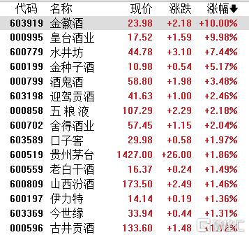 白酒股上涨,金徽酒、皇台酒业涨停,水井坊、金种子酒、酒鬼酒、迎驾贡酒、五粮液等跟涨。