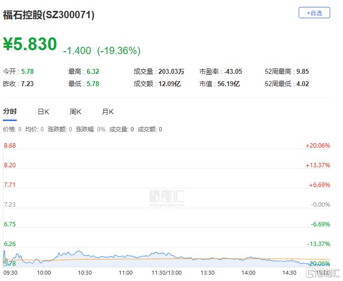 福石控股今日开盘20cm跌停,报5.78元;现已打开跌停,跌幅19.36%。