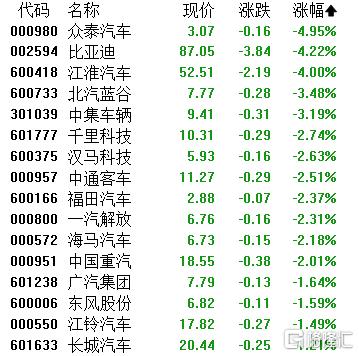 汽车股跌幅居前,众泰汽车、比亚迪跌超4%,江淮汽车、北汽蓝谷、中集车辆、千里科技、汉马科技等跟跌。