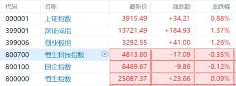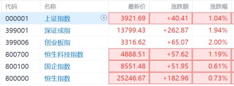 港A股早盘亦同步走高。沪指涨近1%重回3900点上方,深成指涨1.37%,创业板指涨1.26%。港股三大指数早盘均涨超1%,不过截至发稿皆回落,恒生科技指数、国企指数翻绿。