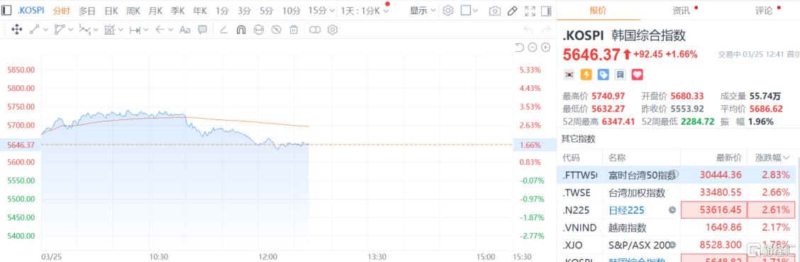 亚洲市场早盘走强。日经225指数盘中一度涨破54000点关口,目前涨逾2.6%。韩国KOSPI指数涨超1.6%,盘中最高涨至5740点。