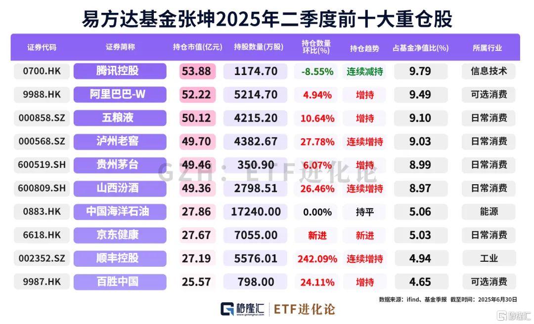 张坤二季度末前十大重仓股为:腾讯控股、阿里巴巴-W、五粮液、泸州老窖、贵州茅台、山西汾酒、中国海洋石油、京东健康、顺丰控股、百胜中国。