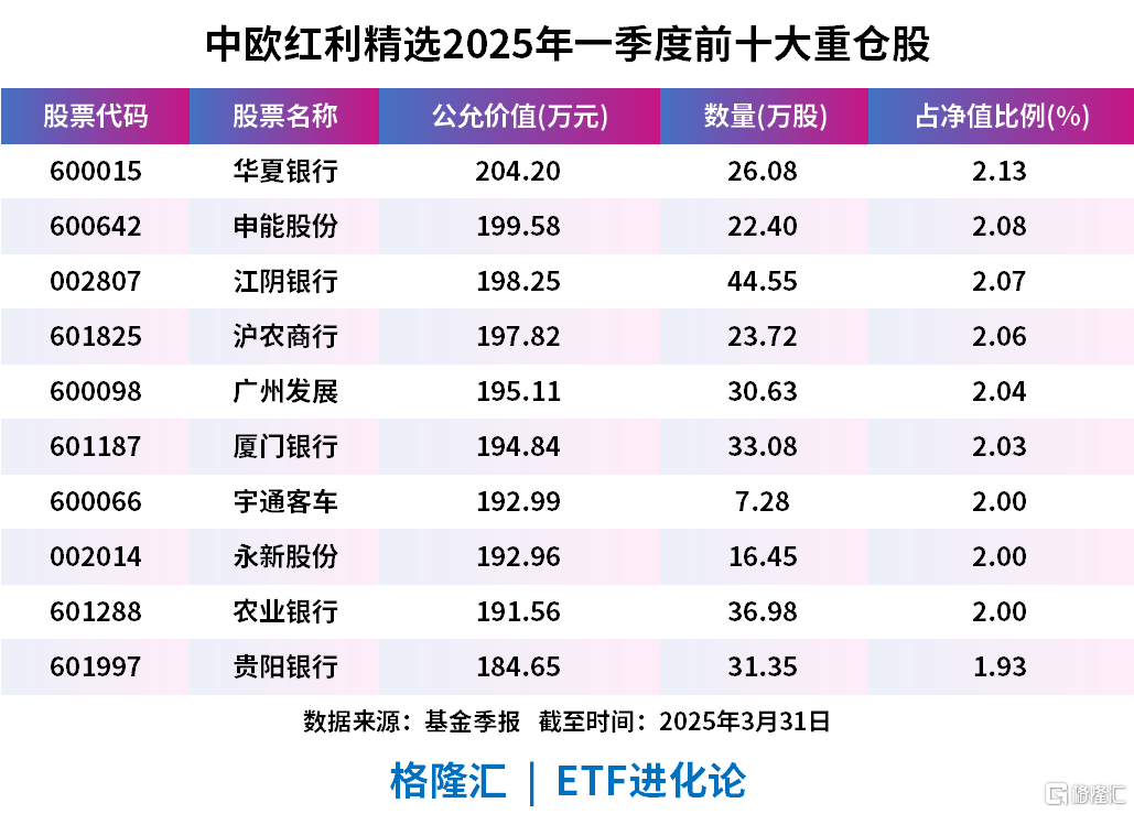 中欧红利精选此前重仓金融股,一季度末,中欧红利精选前十大重仓股为:华夏银行、申能股份、江阴银行、沪农商行、广州发展、厦门银行、宇通客车、永新股份、农业银行、贵阳银行。