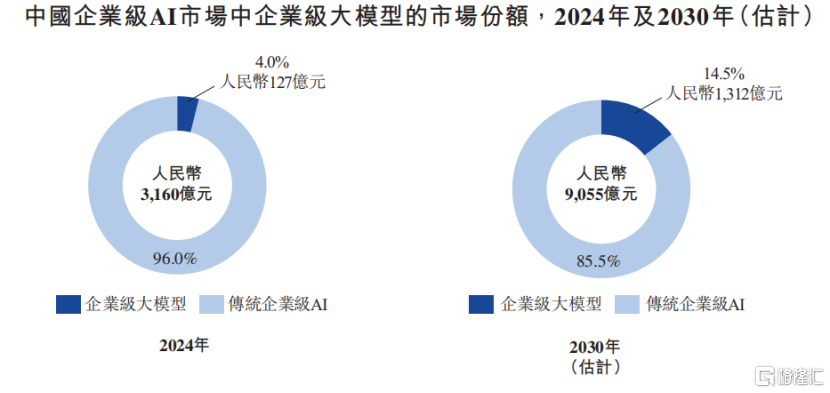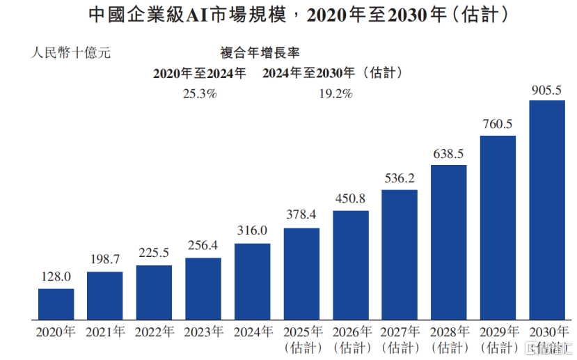 根据灼识咨询的资料,2024年中国企业级人工智能市场规模已达3160亿元,预期至2030年将突破人民币9000亿元,复合年增长率为19.2%。
