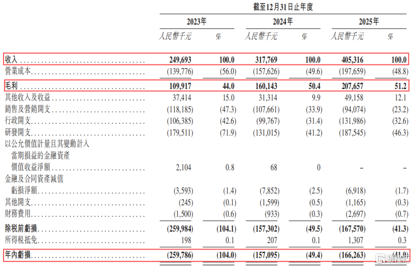 2023年、2024年及2025年(报告期),公司分别实现收入2.5亿元、3.18亿元、4.05亿元,毛利率分别为44.0%、50.4%及51.2%。