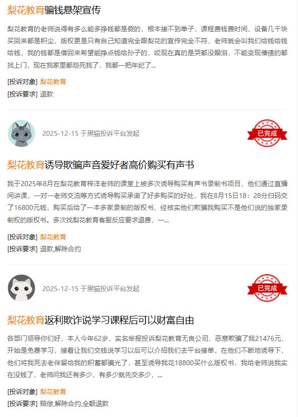 但事实上,梨花教育的课程质量并不尽如人意,有学员反映,课程内容简单,缺乏系统性,与宣传的专业教学差距较大;辅导老师响应不及时,甚至存在敷衍了事的情况;部分课程还存在虚假宣传的问题,声称“学完就能变现”“轻松成为短视频达人”,但实际效果甚微。