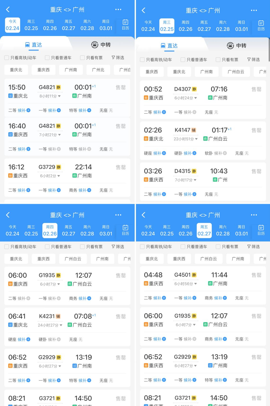 2月24日~27日从重庆出发到广州的高铁已全部售罄,图源:12306