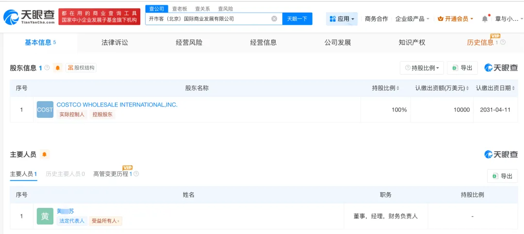 天眼查信息显示,开市客(北京)国际商业发展有限公司成立于2026年4月16日,法定代表人为黄某苏,经营范围包括日用百货销售、家用电器销售等。黄某苏名下并无其他公司,此前也未在公开报道中出现过。