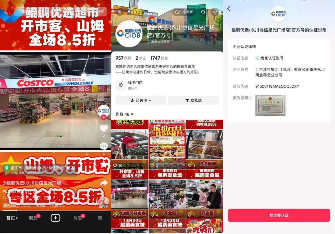 鲲鹏优选超市官方账号发布的视频显示,其门头上印有COSTCO的logo,并售卖开市客、山姆、胖东来同款商品。