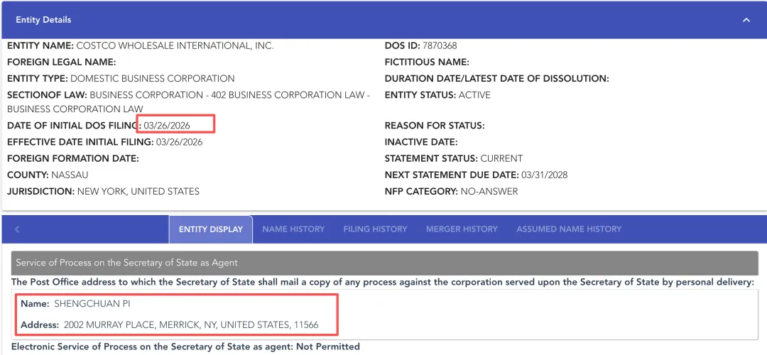 美国纽约州务卿官网信息显示,COSTCO WHOLESALEINTERNATIONAL,INC. 注册于2026年3月26日,其法定联系人为SHENGCHUAN PI,从拼写看是一位华人皮姓老板,而其登记地址在谷歌地图上显示为一处普通住宅。