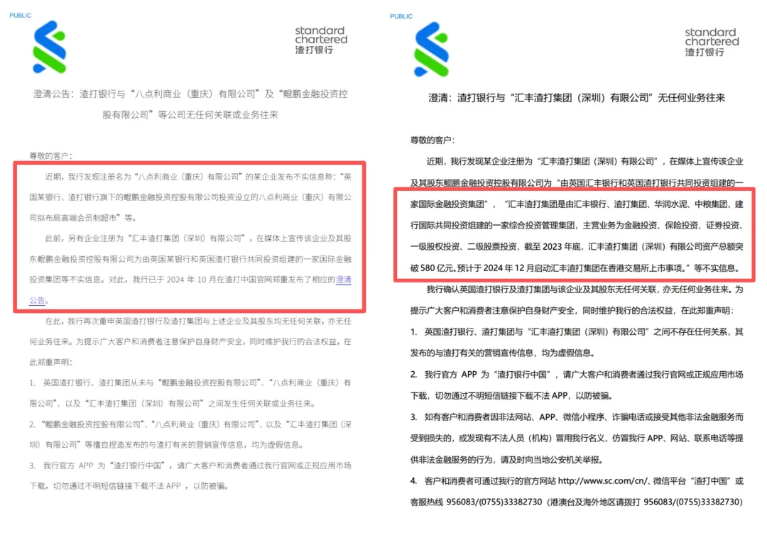 但事实上,渣打银行曾两次发布声明表示与“汇丰渣打集团(深圳)有限公司”无任何业务往来。2025年7月,华润建材科技官网发布声明称有不法企业假冒我司下属子公司开展业务,其中公布的三家企业董事均为皮某某。
