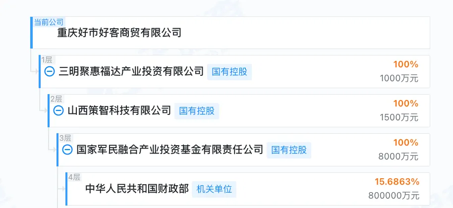 另一则值得关注的细节是,股权穿透图显示重庆好市好客商贸有限公司、三明聚惠福达产业投资有限公司拥有国资背景。据蓝鲸记者了解,这一背景常被前述人员用作进驻商场、招揽供应商的有力背书。有供应商告诉记者,其与皮某某早前的超市项目之间至今仍有货款拖欠纠纷。