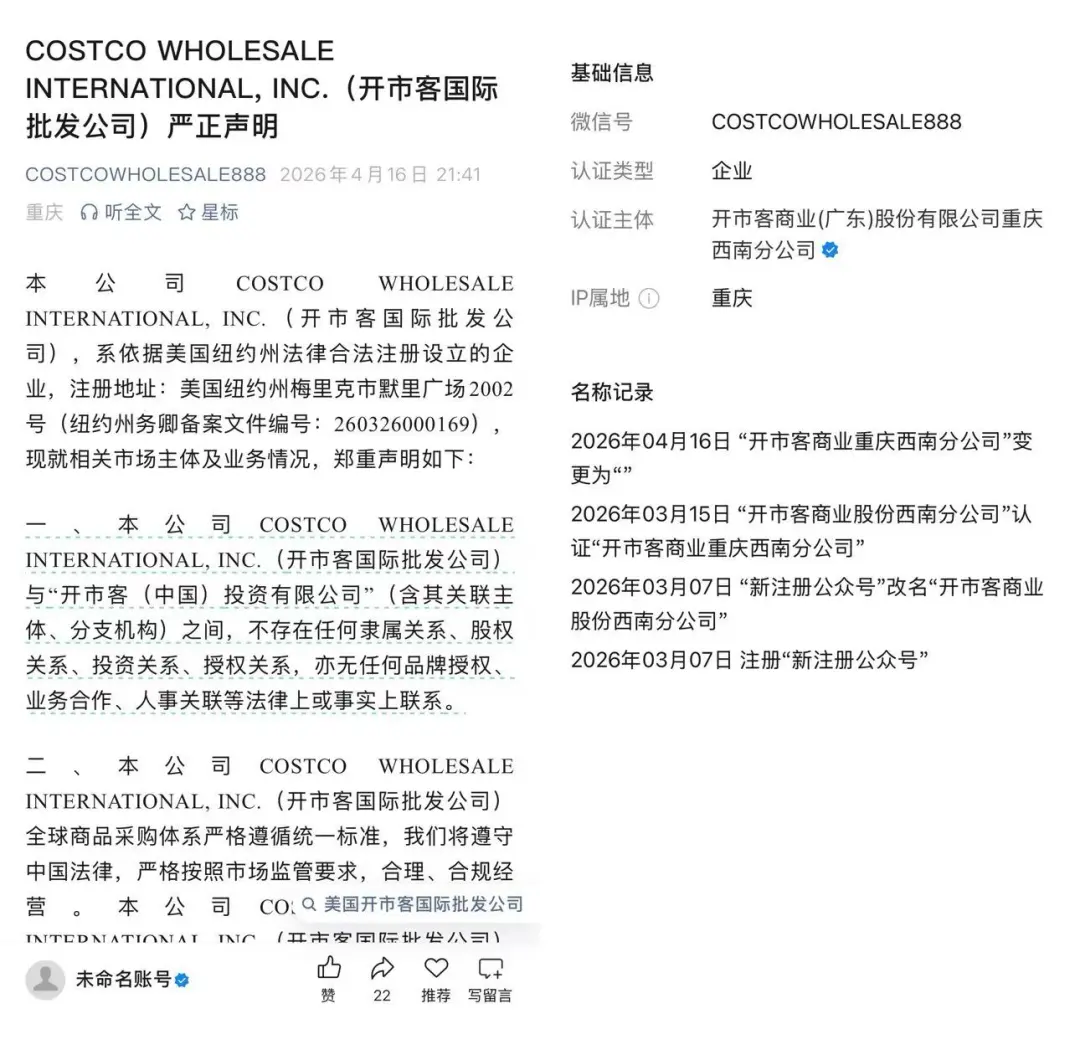 有意思的是,开市客商业(广东)股份有限公司重庆西南分公司也在近日发布了COSTCOWHOLESALEINTERNATIONAL,INC(纽约州)的严正声明——这份声明甚至比开市客北京公司发的还早几天。其与开市客北京公司、开市客纽约州公司的关系值得探讨。