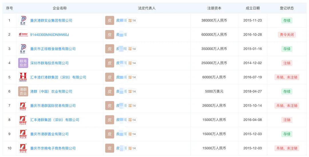 天眼查显示,皮某某目前在14家企业任职,经营范围覆盖基本信息、商品销售、货物进出口、房地产、金融投资等,其名下有多家企业被责令关停/吊销/经营异常。