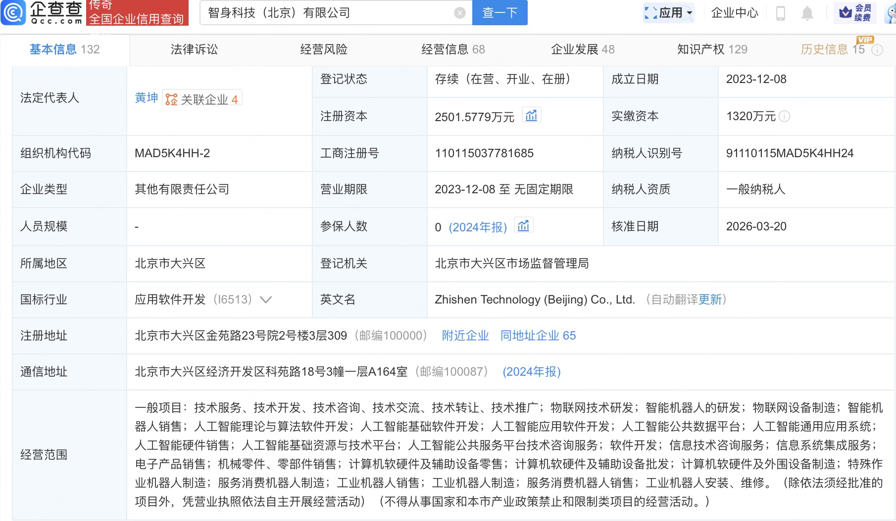 企查查APP显示,近日,智身科技(北京)有限公司发生工商变更,新增茅台(贵州)高质量成长股权投资合伙企业(有限合伙)、豪鹏科技(001283)等为股东,同时注册资本增至约2501.6万元。 企查查信息显示,该公司成立于2023年,经营范围含智能机器人的研发、人工智能应用软件开发、工业机器人制造等。公开信息显示,智身科技是一家专注于具身智能领域的科技公司。