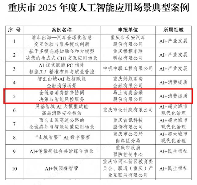 大会期间,由重庆市大数据应用发展管理局、重庆市科学技术局联合评选的“2025年度优秀人工智能应用场景案例”正式揭晓。评选活动共征集六大领域151个应用场景,共有41个典型案例脱颖而出。马上消费申报的“全链路消费信贷协同决策与智能风控服务”项目入选“AI+消费提质”领域优秀案例,肯定了公司在智能风控与信贷决策领域的技术沉淀与创新实力。