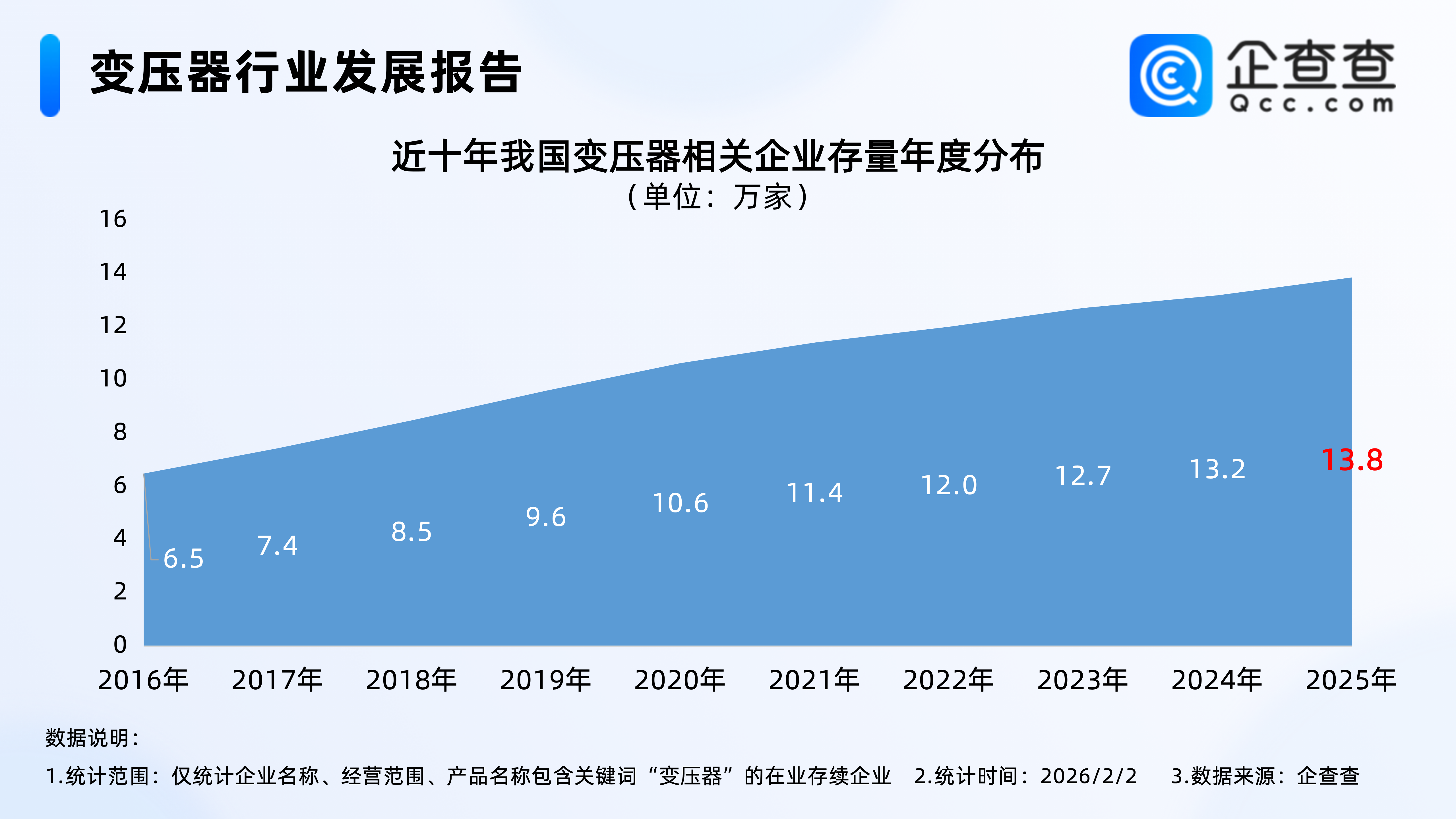 企查查数据显示,近十年,我国变压器相关企业存量逐年增加,2020年相关企业存量正式突破10万家,达10.6万家;2025年年底,我国在业存续13.8万家变压器相关企业。截至2026年2月2日,我国现存13.9万家变压器相关企业。