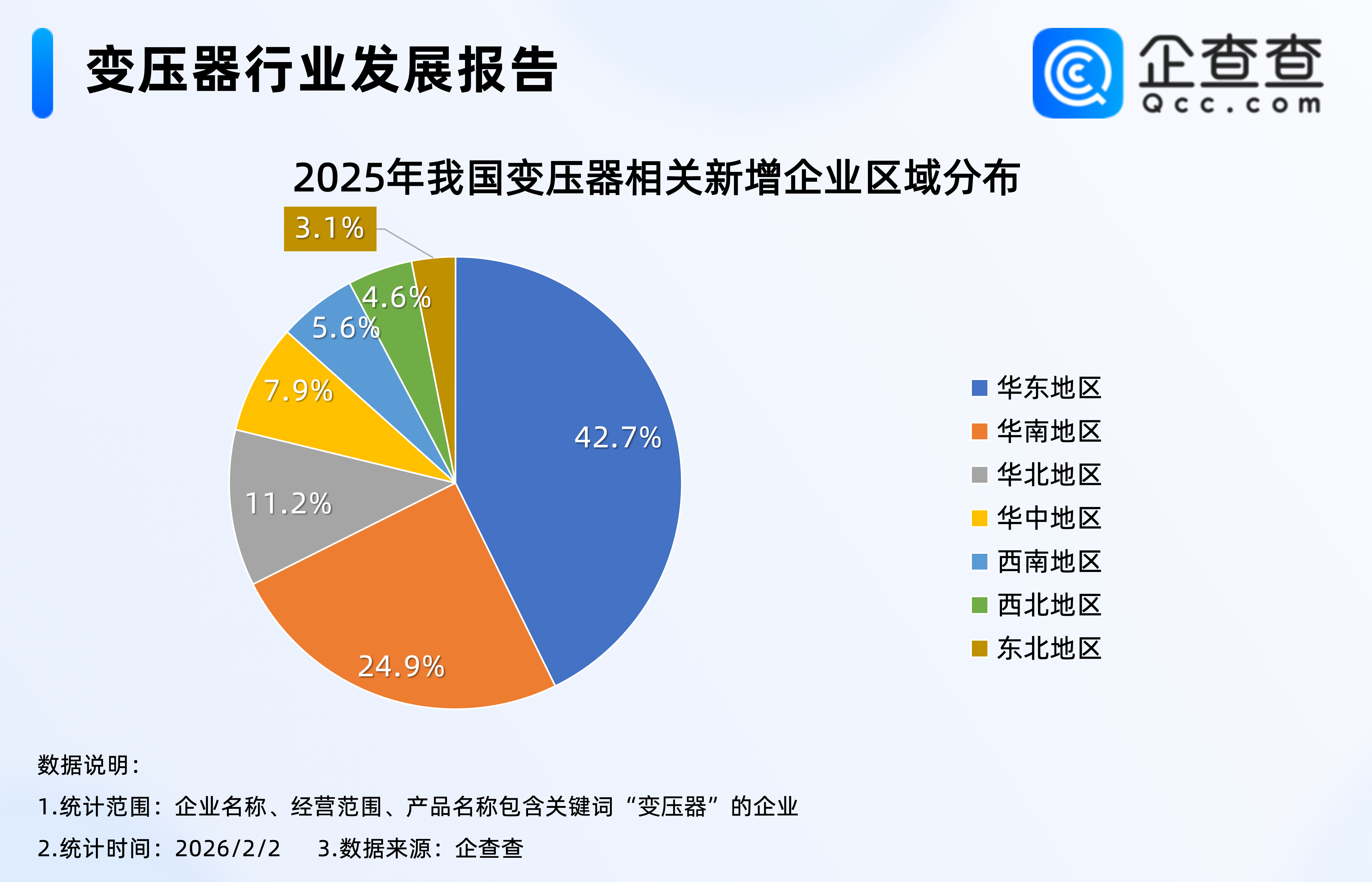 企查查数据显示,2025年全年,我国累计注册1.27万家变压器相关企业(仅统计企业名称、经营范围、品牌产品含关键词“变压器”的企业),相比2024年同期增加4.9%;其中位于华东地区最多,占比42.7%,其次是华南地区,占比24.9%;截至2月2日,2026年我国已注册1028家变压器相关企业。存量方面,近十年,我国变压器相关企业存量逐年增加,截至2026年2月2日,我国现存13.9万家变压器相关企业。