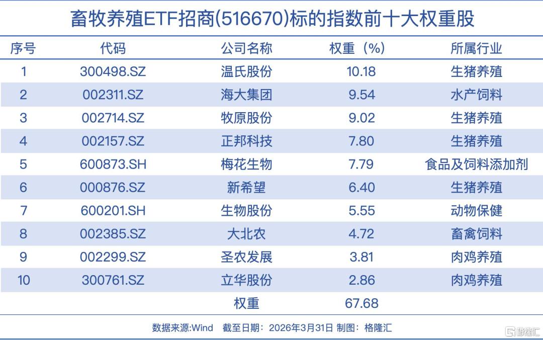 畜牧养殖ETF招商(516670)跟踪中证畜牧养殖指数,聚焦A股上市的头部养殖企业,“含猪率”超过六成,疫苗,饲料等养猪上下游+禽类、水产等养殖概念占比约40%,前十大成份股覆盖温氏股份、海大集团、牧原股份、正邦科技、梅花生物、新希望等养殖行业龙头。