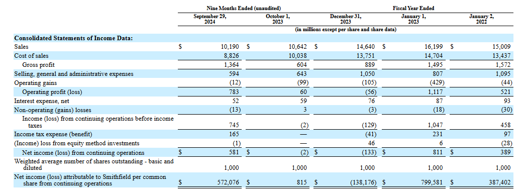 招股书显示,在过去的2021年、2022年、2023年和2024年前九个月,史密斯菲尔德食品的收入分别为150.09亿、161.99亿、146.40亿和 101.90亿美元,相应的净利润分别为3.89亿、8.11亿、-1.33亿和 5.81亿美元。