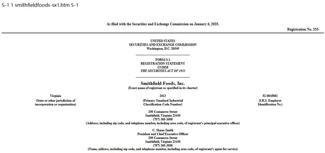 2025年1月6日,万洲国际(00288.HK)旗下的Smithfield Foods, Inc.史密斯菲尔德食品有限公司(以下简称史密斯菲尔德食品)在美国证券交易委员会(SEC)公开披露招股书,股票代码SFD,拟在美国纳斯达克IPO上市。