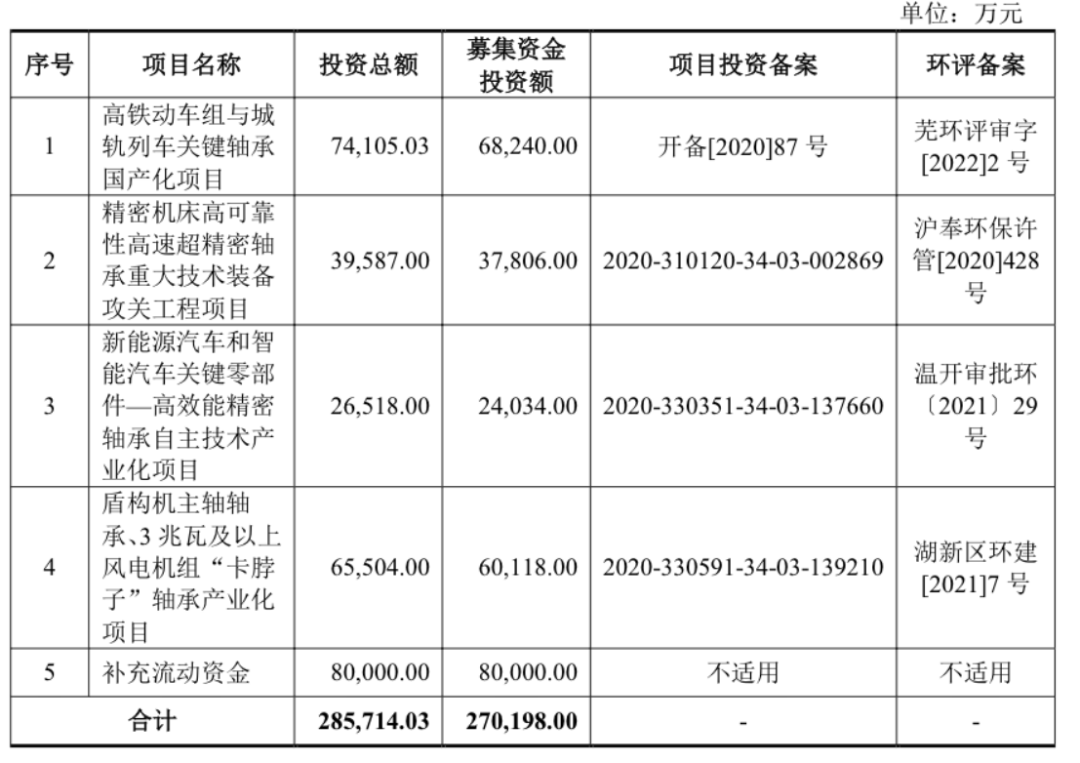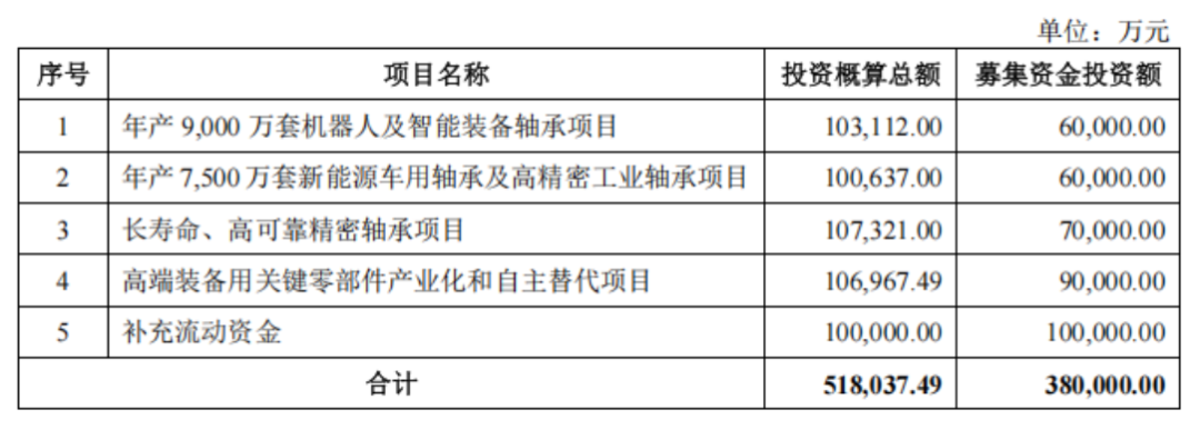 对比首次申报,补充流动资金拟投入金额从8亿元增长至10亿元,增幅达25%;机器人及智能装备轴承项目、新能源车用轴承项目为新增项目;长寿命高可靠精密轴承项目及高端装备用关键零部件产业化、自主替代项目亦为新增项目。