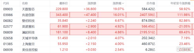 港股天数智芯涨约19%、兆易创新大涨超16%,A股东阳光、环旭电子、石英股份、高新发展、博杰股份等涨停。