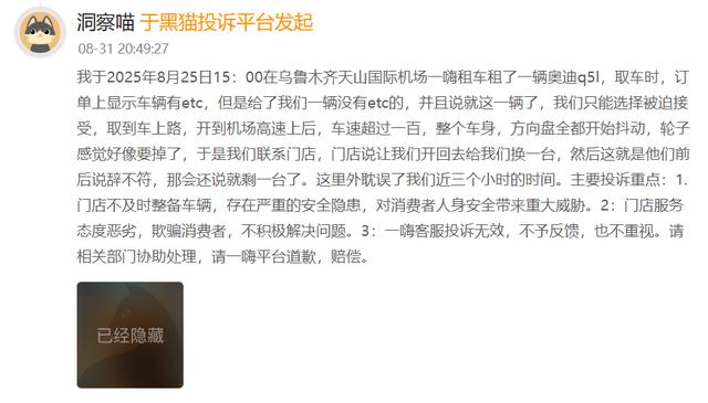 一名用户分享了自己在一嗨租车平台上租到故障车的情况,车辆上高速后车身剧烈抖动,存在严重安全隐患,给消费者的人身安全带来了严重威胁,但门店服务态度恶劣、欺骗客户,平台客服在接到投诉后也不予反馈。