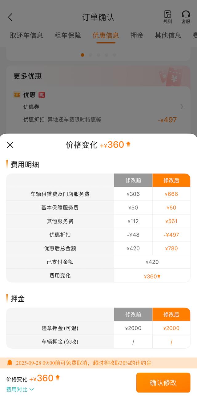 同时,其他服务费(包括基本保障服务费、车辆整备费、尊享保障等)变更为561元,而此前为112元,相对增加449元。不过,该订单显示优惠497元(此前优惠48元),合计780元,较此前订单增加360元。