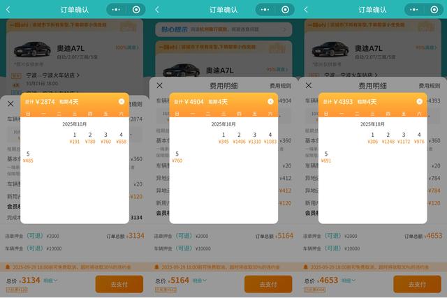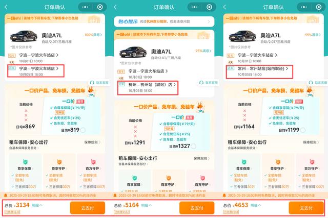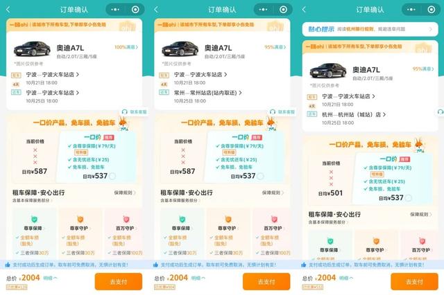 需要指出的是,上述价格差仅出现在中秋国庆“双节”期间,在笔者将奥迪 A7L租赁时间改为10月21日18点至10月25日18点后,三个还车点的总报价均为2004元,且单日车辆租赁费及门店服务费一致。