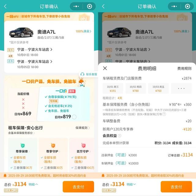 结果显示,如果取车、还车地点一致(均为宁波市宁波火车站店),叠加120元新用户专享券后这款车型的租赁费用为3134元,其中包括2874元车辆租赁费及门店服务费、360元基本保障服务费,以及20元车辆整备费。
