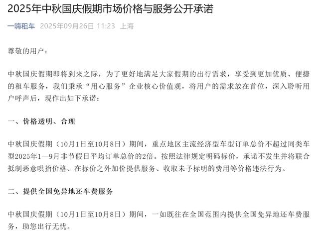 根据一嗨租车9月26日发布的《2025年中秋国庆假期市场价格与服务公开承诺》,该公司承诺在中秋国庆假期期间一如既往在全国范围内提供免异地还车费服务,帮助用户降低租车出行成本。