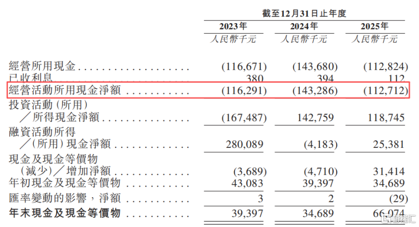 由于持续亏损,公司报告期内的经营活动现金净额均为负,分别为-1.16亿元、-1.43亿元、1.13亿元。截至2025年底,公司账上现金及现金等价物约6607万元。