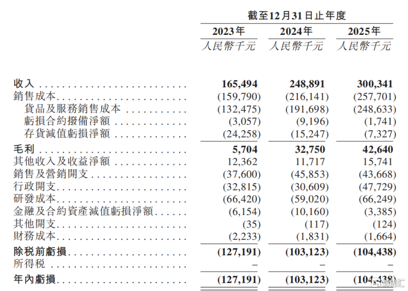 2023年、2024年及2025年(报告期),公司的收入分别1.65亿元、2.49亿元、3亿元。不过目前尚未盈利,报告期内净利润分别为-1.27亿元、-1.03亿元、-1.04亿元,三年累计亏损3.34亿元。